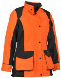 Funkčná dámska bunda určená do pohonu alebo pre psovodkyne. Pevný, vetruodolná s ventiláciou v signalizačnej farbe. Je vetru a vodeodolná s vodotesnými švami. V stojačiku je integrovaná kapucňa. Pre dobrú viditeľnosť v oranžovej farbe. So sieťovou podšívkou.
